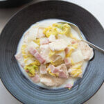 Hen and Cabbage Simmered in Milk is a comforting dish made with juicy, tender rooster breast, Chinese language cabbage, and bacon cooked in milk. It seems to be virtually like a stew, however I wouldn’t name it a stew as a result of the components will not be gradual cooked for a very long time, and the broth is just not thick both. It’s near a soup.